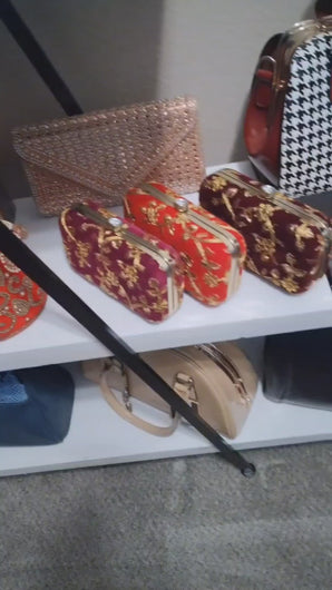 Prosperity Embroidered Clutch, featuring a beautifully crafted embroidery design with a stunning diamond centerpiece. This clutch blends sophisticated artistry with functional elegance, perfect for making a confident statement at any event. Its intricate embroidery adds a refined texture, making it an exquisite accessory for both day and evening occasions.