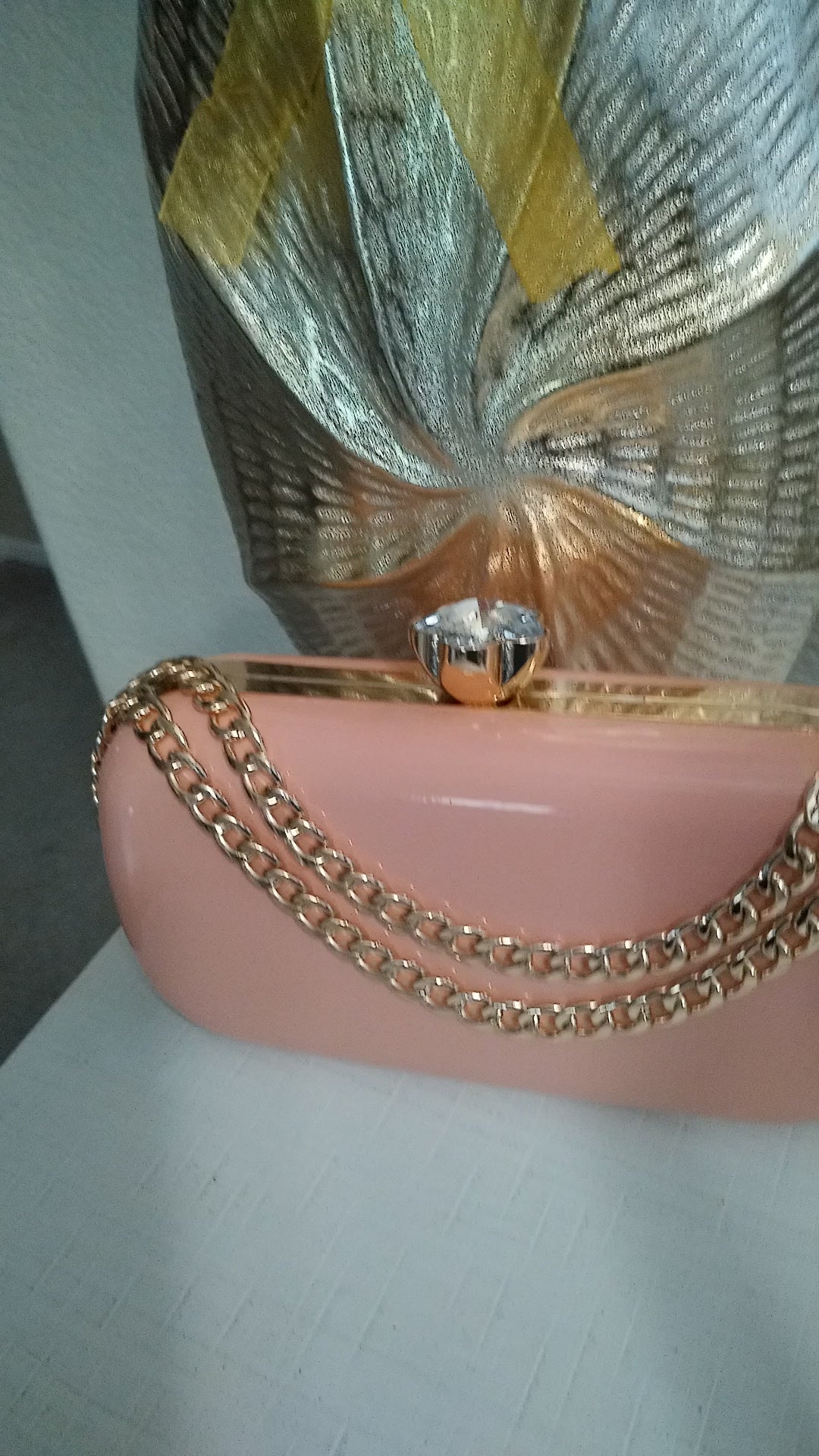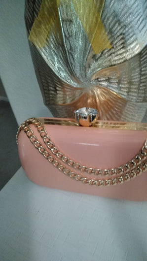 Double Chain Evening Clutch, featuring diamond-centered that add a subtle yet luxurious sparkle. Designed for women who demand impeccable glamor, this peachy pastel clutch combines elegant detailing with a versatile double chain strap for both hand-held and shoulder wear. Perfect for special occasions, it seamlessly enhances your look while keeping essentials secure and accessible.