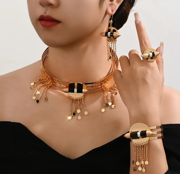 This luxurious 24K gold-plated jewelry set, featuring a necklace, earrings, bracelet and ring is perfect for any occasion. Crafted with exquisite with high-quality copper element.