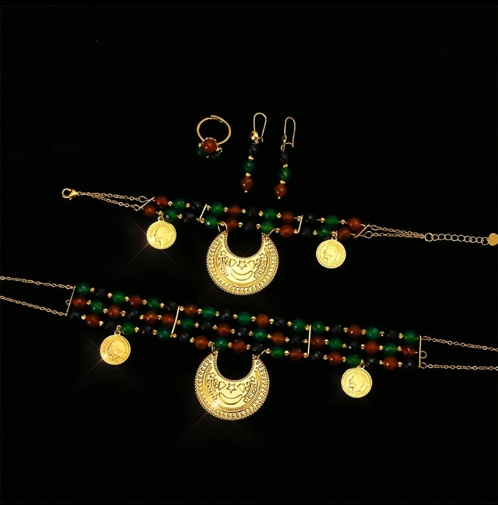This luxurious 18k gold-plated jewelry set crafted from copper, featuring exquisite luxurious design includes necklace, earrings, bracelet and ring is perfect for weddings, events and special occasions.